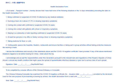 申领办法为:相关外国公民应在获得核酸检测阴性报告后,将有效护照资料页、检测阴性报告和申请人已签字的健康状况声明书的扫描件,根据检测机构所在领区发送至相应的中国使领馆指定电子邮箱(邮件主题为“HS+姓名+出发日期”)。中国驻当地使领馆审核通过后,以电子邮件方式将加盖使领馆印章的健康状况声明书扫描件发还申请人,请申请人自行打印并携带至机场。请注意在健康状况声明书有效期内乘机,并在登机前配合航空公司查验。
