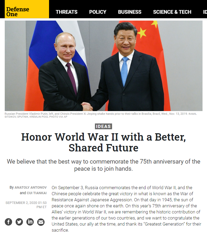 2020年9月2日,中国驻美国大使崔天凯和俄罗斯驻美国大使安东诺夫在防务一号(Defense One)网站发表题为《铭记历史开创未来》的联合署名文章,纪念中国人民抗日战争暨世界反法西斯战争胜利75周年。全文译文如下: