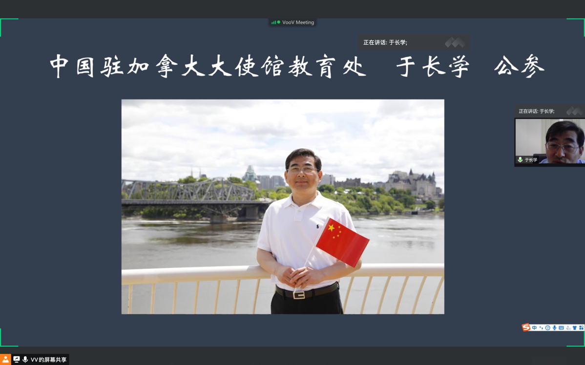 于长学在卡尔顿大学中国留学生新生答疑会的致辞中表示,由于疫情原因,许多同学目前只能在国内通过网络上课,但是,疫情和距离无法阻挡同学们高涨的学习热情。于长学转达了驻加拿大使馆和教育处对留学人员的关心,介绍了疫情期间个人防护注意事项。他希望同学们留学期间时刻心系祖国,在学习和生活中严格遵纪守法,展现中国留学生良好风貌,作中加交流的文化使者,安全至上,学业为先,并祝愿同学们实现平安留学、成功留学。