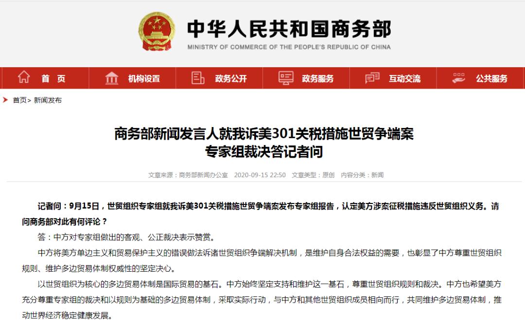 记者问:“9月15日,世贸组织专家组就我诉美301关税措施世贸争端案发布专家组报告,认定美方涉案征税措施违反世贸组织义务。请问商务部对此有何评论?”