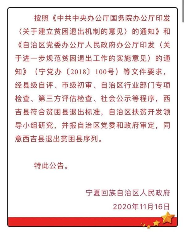经宁夏回族自治区政府第78次常务会议研究,11月16日,自治区人民政府正式批复同意西吉县退出贫困县序列。至此,宁夏全区9个贫困县全部实现脱贫摘帽,标志着宁夏区域性整体贫困问题基本得到解决,历史性地告别绝对贫困,为如期全面建成小康社会奠定坚实基础。在西吉县的脱贫道路上,欧美同学会和广大海归学长的帮扶书下了浓墨重彩的一笔。