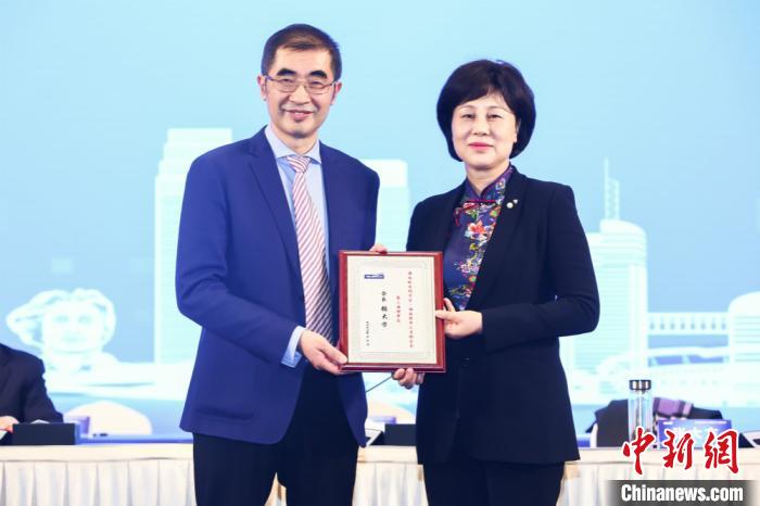 湖南省委常委、省委统战部部长黄兰香(右)向湖南欧美同学会·湖南留学人员联合会第三届理事会会长张大方授牌。湖南省委统战部供图