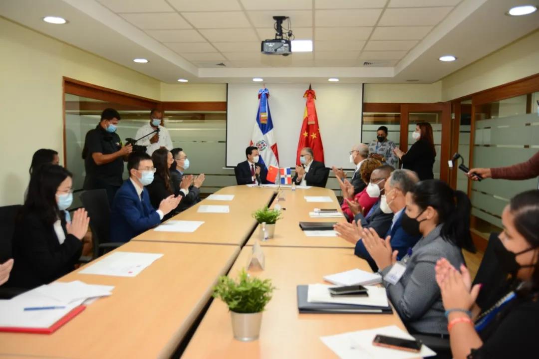 海外网3月23日电 据中国驻多米尼加大使馆公众号消息,2021年3月22日,张润大使同多米尼加经济、规划和发展部长塞阿拉共同出席中多经济技术合作协定签字仪式。多总统府部副部长奥尔古因、经济部副部长多特尔、众议院多中友好小组主席赫罗尼莫等参加活动。