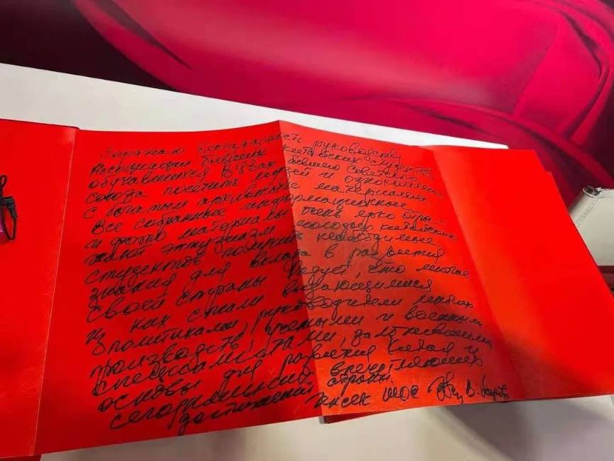 他在感言中写道:“由衷感谢留苏分会的组织,让我们有幸参观了档案馆并了解到了丰富的档案资料。这里所收集到的所有文本与影像资料都鲜明地反映了中国青年学子渴求获取必备知识从而为祖国发展做出贡献的愿望。我们很高兴地看到,许多来自中国的留学生成为了杰出的政治人物、各行业的领导人物、学者以及军事专家,正是他们为中国的发展以及现今中国所取得的巨大成就奠定了基础。”
