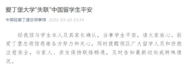中国侨网3月21日电 据中国驻爱丁堡总领事馆微信公众号消息,在英中国女留学生失联19天引发关注。中国驻爱丁堡总领事馆微信公众号北京时间20日晚发布消息称,经总领馆与学生本人及其家长确认,当事学生平安,请大家放心。