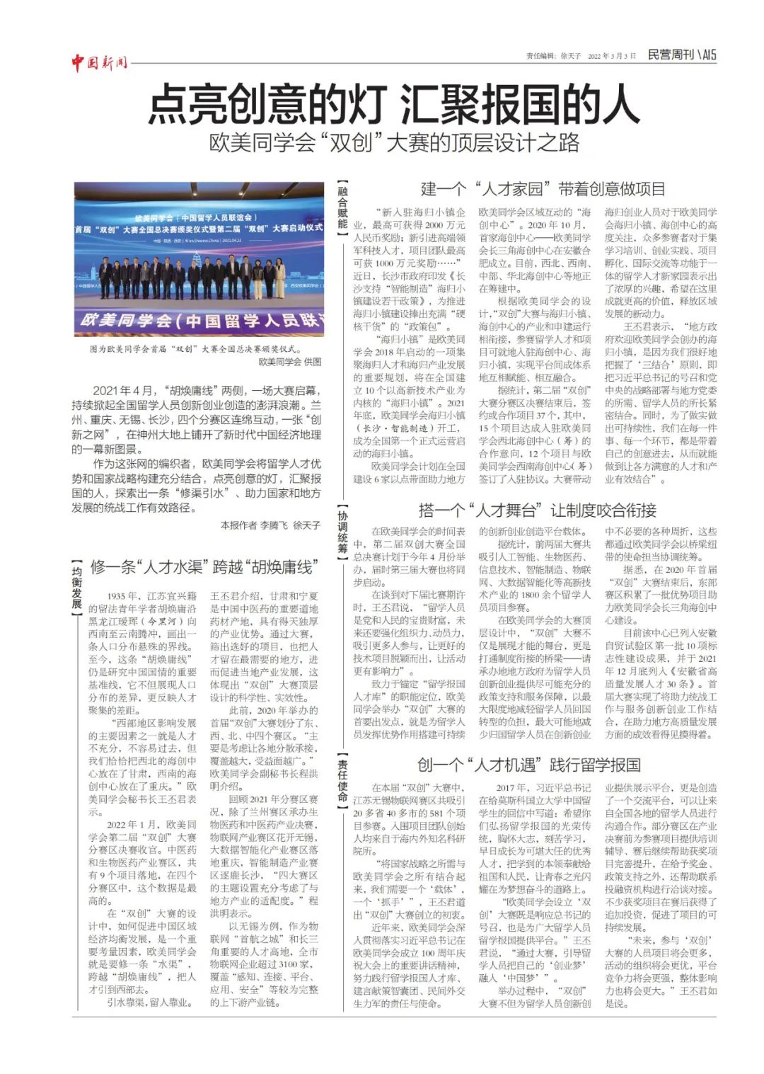 “创新是一个民族进步的灵魂,是一个国家兴旺发达的不竭动力,也是中华民族最深沉的民族禀赋。”习近平总书记在欧美同学会成立100周年庆祝大会上指出,在激烈的国际竞争中,惟创新者进,惟创新者强,惟创新者胜。留学人员视野开阔,理应走在创新前列。为贯彻落实国家创新驱动发展战略,推动经济社会高质量发展,激发海内外高层次留学人才创新创业创造热情,2020年10月21日,欧美同学会举办首届“双创”大赛,2021年4月23日,欧美同学会首届“双创”大赛全国总决赛颁奖仪式暨第二届“双创”大赛启动仪式隆重举行,目前,第二届“双创”大赛全国总决赛举办在即。“双创”大赛对欧美同学会和广大留学人员来说,是平台载体,也是创新性设计。日前,《中国新闻》报聚焦欧美同学会“双创”大赛和留学人员创新创业创造,刊载专版文章,以下是报道文章。