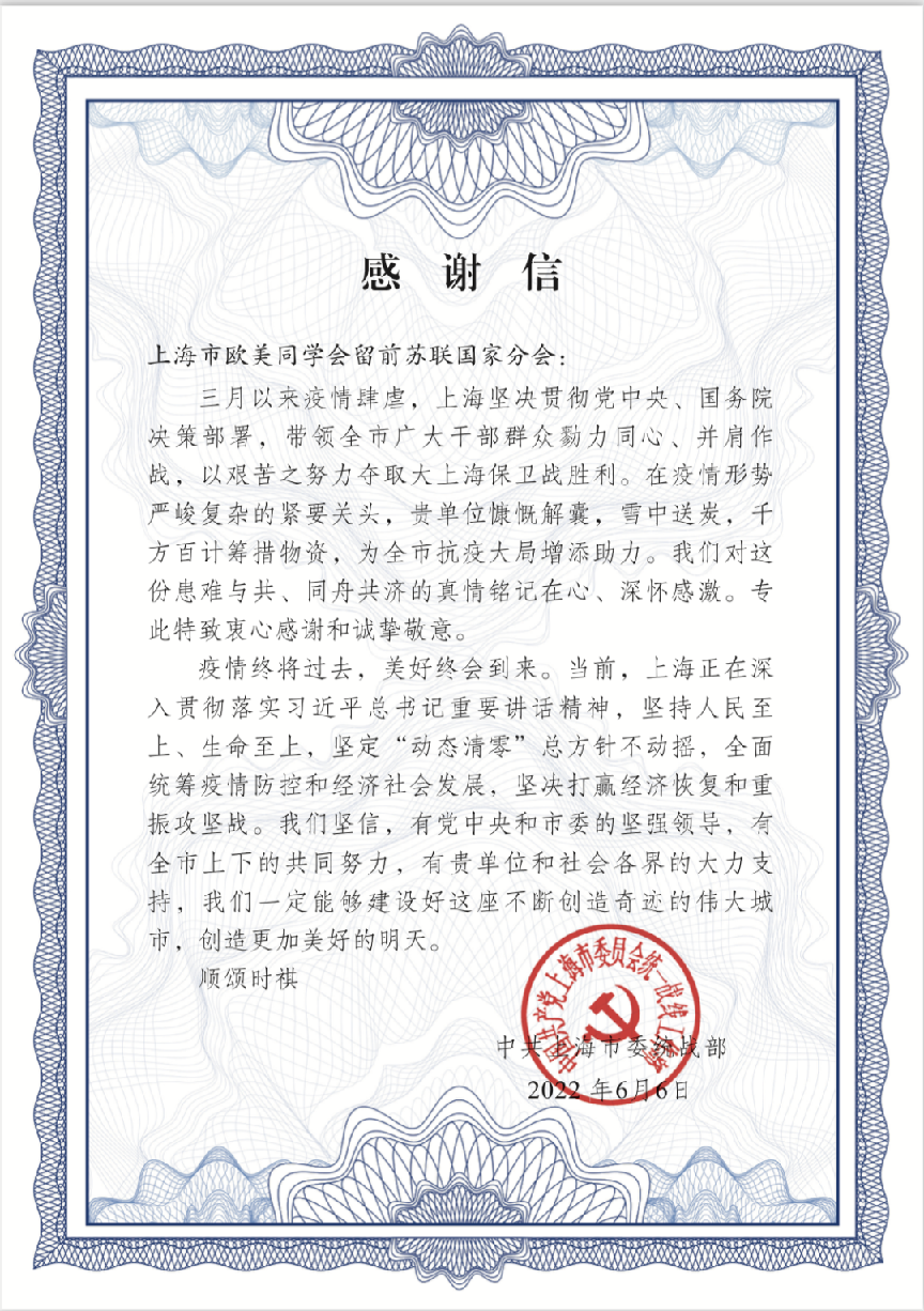 日前,上海市欧美同学会留苏分会收到了一封感谢信。这封感谢信来自上海市委统战部。信中写道: