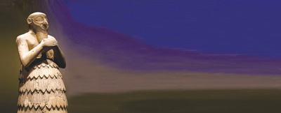 身着典型苏美尔人服饰、做祈祷姿势的祭拜者雕像。
