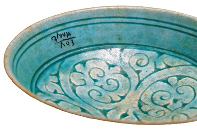 这件来自叙利亚的蓝绿色釉陶碗,颜色与天空的颜色相近,专家发现其陶坯的改良可能是模仿中国制瓷技术的结果。虽然当时该地区陶瓷技艺还未达到中国制瓷技术水准,但在阿拔斯王朝时期,这种釉陶器皿在叙利亚北部地区已经大量生产。
