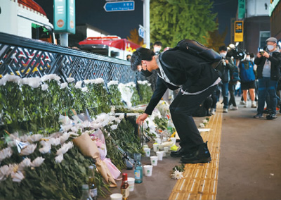10月30日,一名男子在韩国首尔踩踏事故现场附近悼念。