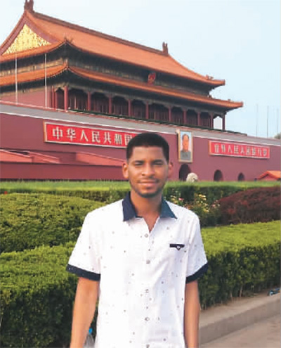 从第一次踏上中国的土地到现在,鲍世富一直用豪萨语介绍他眼中的中国。图为他在北京天安门城楼前留影。