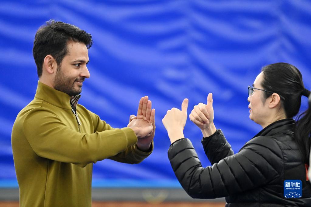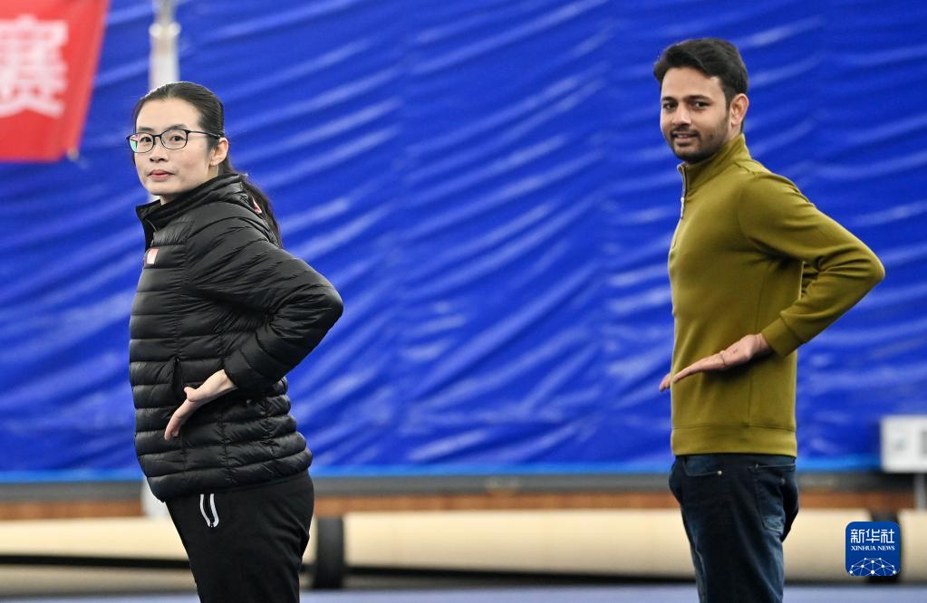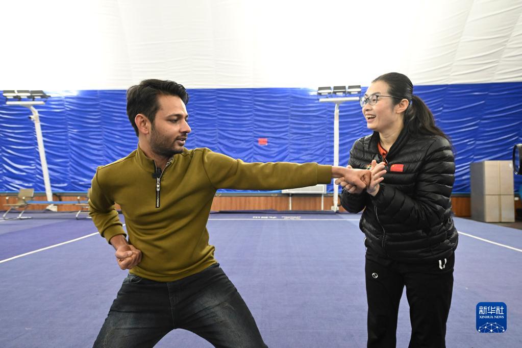 在天津市西青区精武镇精武会馆,霍静虹指导穆罕默德·纳比尔(左)练习“霍氏练手拳”(12月25日摄)。