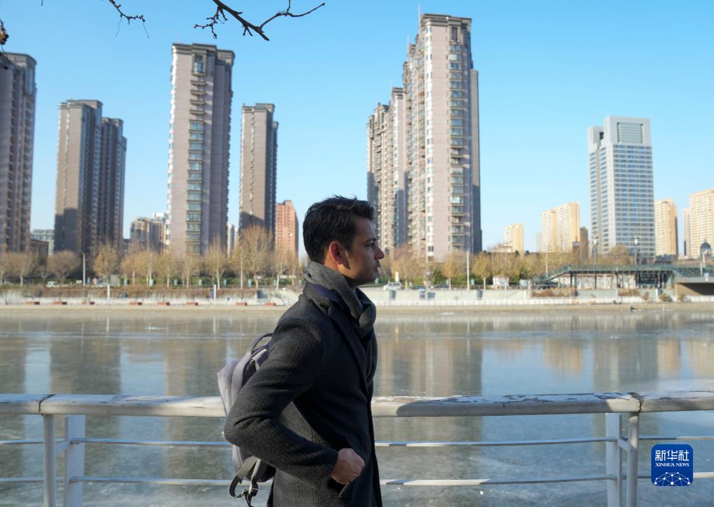 穆罕默德·纳比尔走在天津海河边(12月26日摄)。