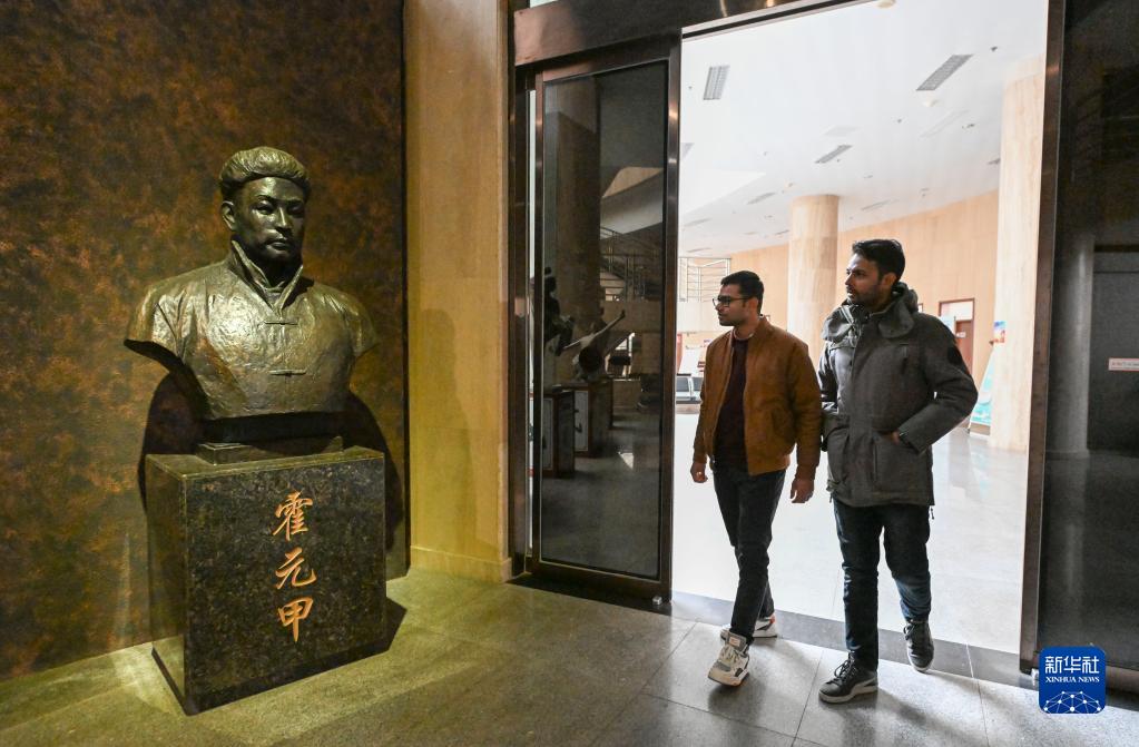 穆罕默德·纳比尔(右)与好友一起在天津市西青区精武镇霍元甲纪念馆内参观(12月25日摄)。