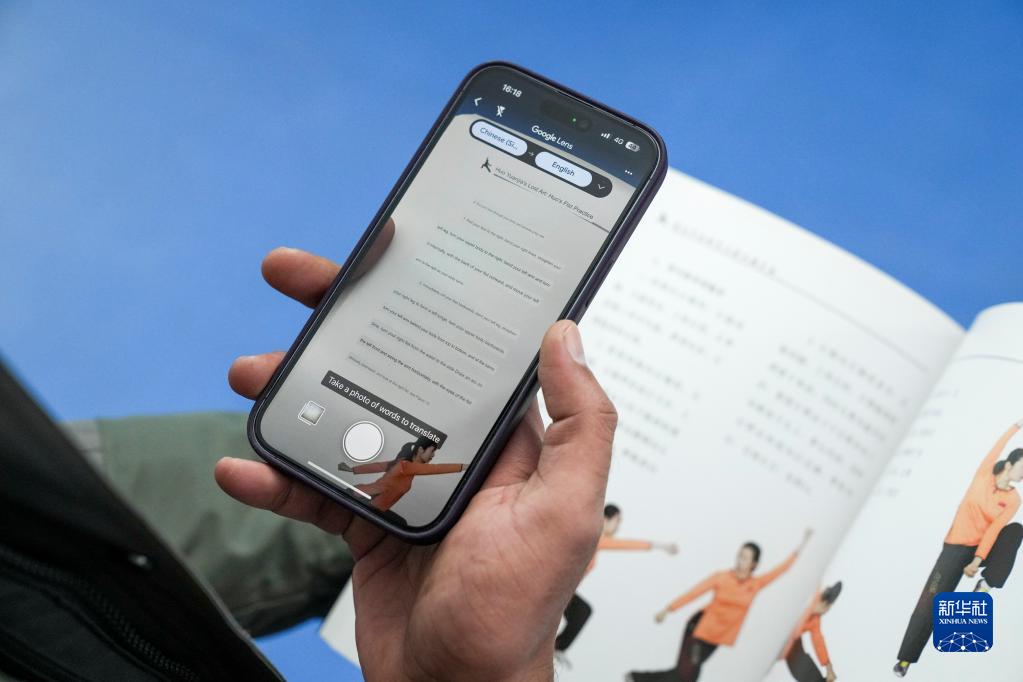 在天津市西青区精武镇精武会馆,穆罕默德·纳比尔利用翻译软件阅读有关“霍氏练手拳”的书籍(12月25日摄)。