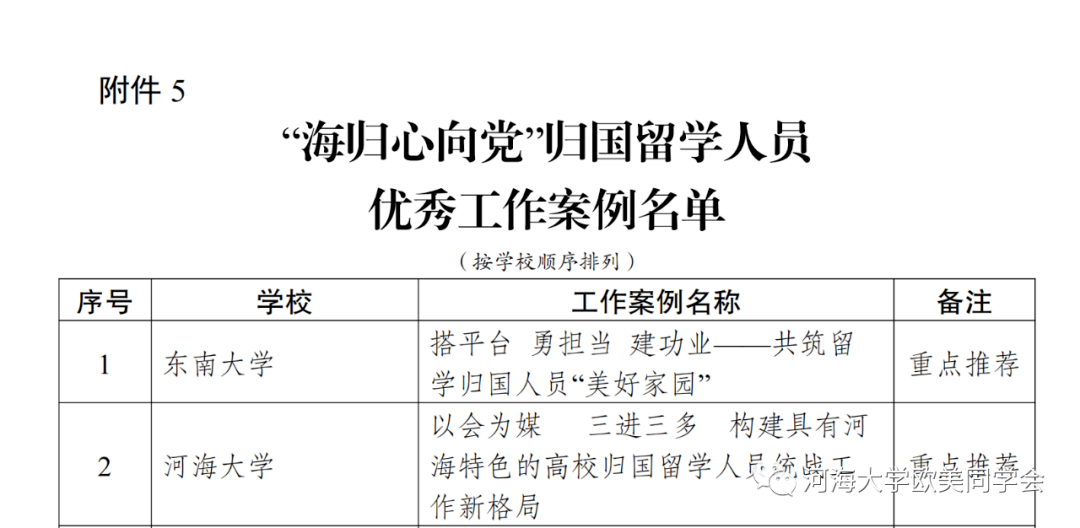 近日,江苏省委教育工委公布了全省高校统一战线“携手喜迎二十大·同心共筑教育梦”主题宣传教育系列活动评奖结果。河海大学欧美同学会(河海大学留学人员联谊会)留学人员工作“以会为媒三进三多构建具有河海特色的高校归国留学人员统战工作新格局”入选江苏省高校归国留学人员优秀工作案例并获得重点推荐(共20项)。此前河海大学欧美同学会已在江苏省高校统战工作实践创新成果评选中获二等奖。
