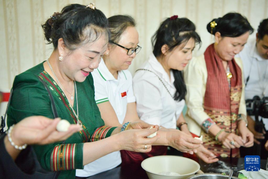 1月10日,在位于老挝万象的老挝中国文化中心,老挝全国妇联主席因拉万·乔本潘(右一)和老挝“六七”学校校友一起包饺子。新华社发(达蒙摄)