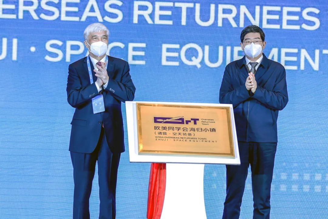 全国人大常委会副委员长、民盟中央主席、欧美同学会会长、中科院院士丁仲礼和浙江省委常委、统战部部长,浙江省政协党组副书记邱启文共同为欧美同学会海归小镇(诸暨·空天装备)揭牌。