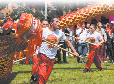 1月22日,在哥伦比亚首都波哥大市中心的93公园,演员在“欢乐春节”庙会上表演舞龙。新华社记者周盛平摄