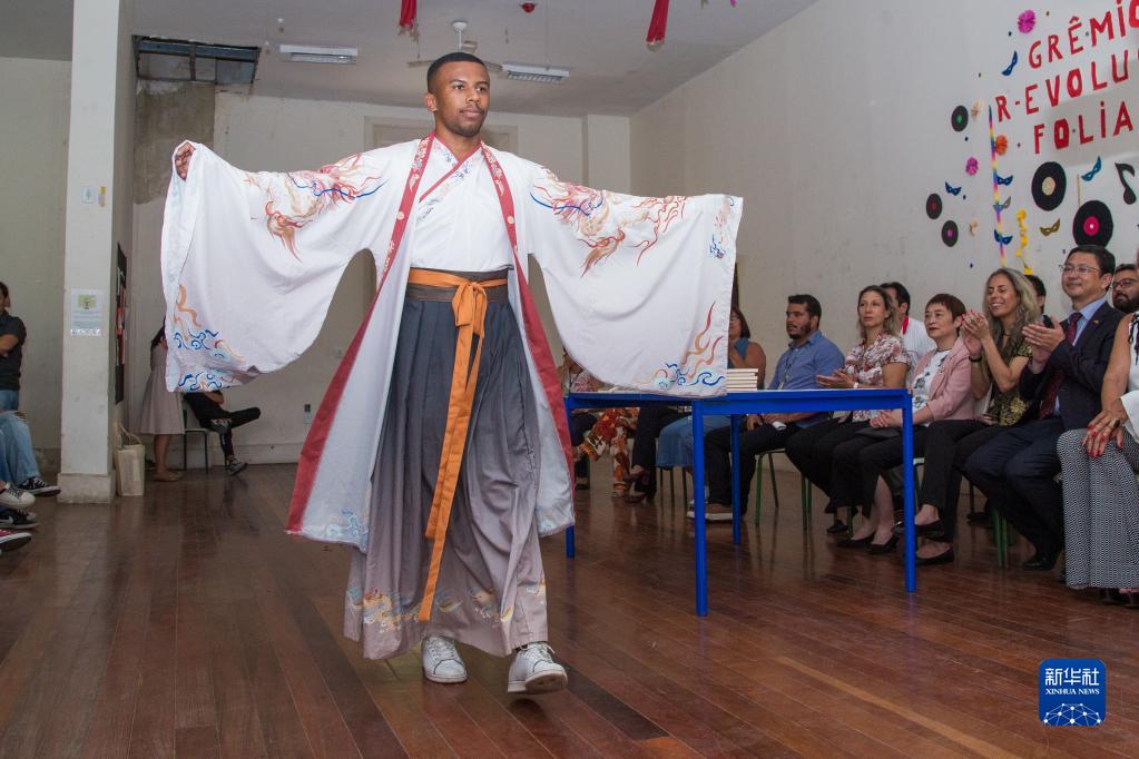 2月14日,在巴西尼泰罗伊,葡中双语学校在接受中国驻里约热内卢总领馆赠书仪式上进行汉服展示。新华社发(克劳迪娅·马尔提尼摄)