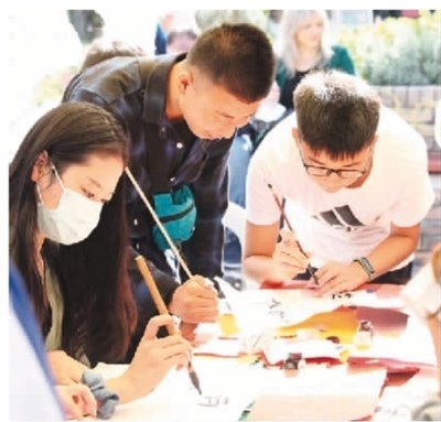 国际中文教育志愿者展示中国书法。