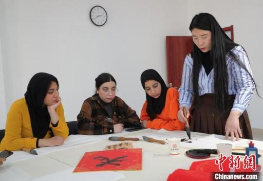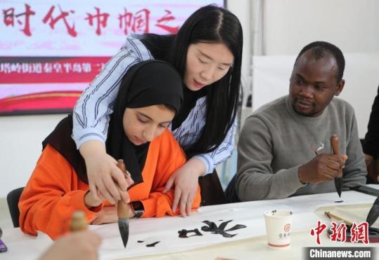 图为活动室内,社区教育管理中心指导教师带领燕山大学外国留学生体验书法魅力。曹建雄摄