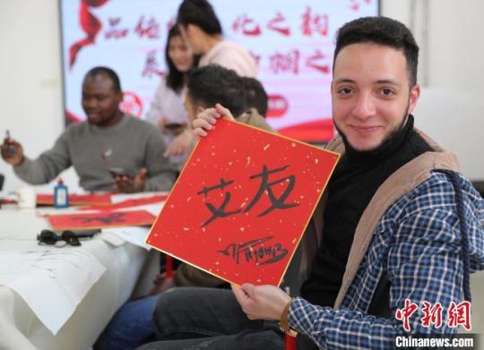 图为燕山大学外国留学生展示书写的书法作品。曹建雄摄