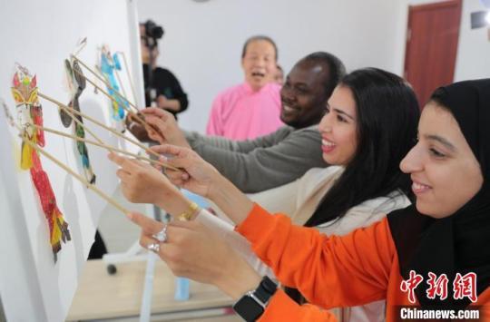 图为燕山大学外国留学生体验皮影表演技艺。曹建雄摄