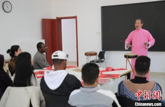 图为专业老师带领燕山大学外国留学生表演京东大鼓。曹建雄摄