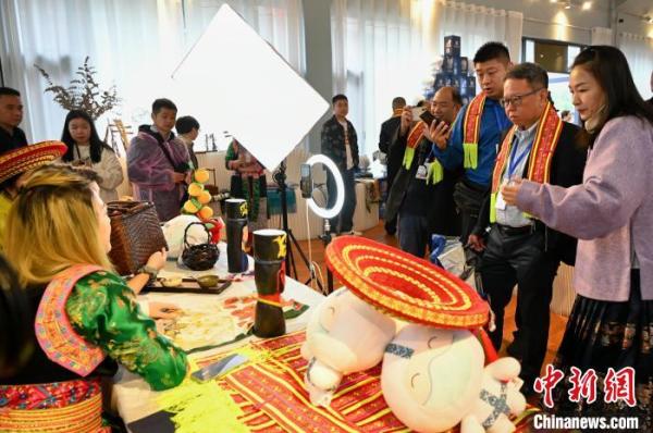 雁鹅界古村花瑶文化体验馆内,两位花瑶姑娘用英语进行“非遗出海”网络直播,向国内外网友推介非遗创意产品,吸引了东盟国家媒体记者们的注意。