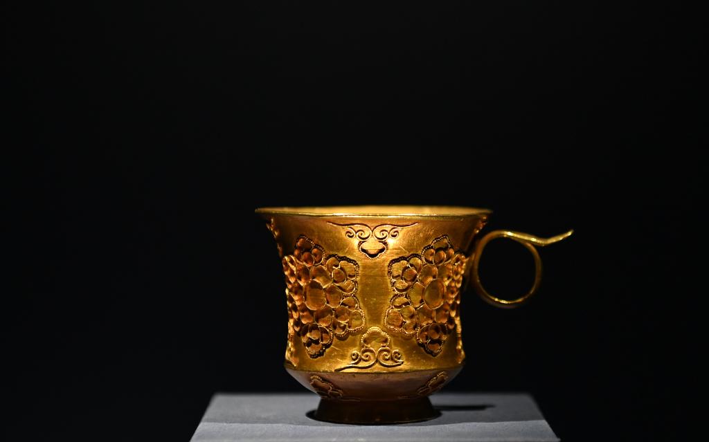 这是5月11日在陕西历史博物馆拍摄的掐丝团花纹金杯。唐代带把杯除部分器物直接来自中亚粟特,还有部分属于唐人仿制粟特风格的作品,这些物品都是东西方文明通过丝绸之路进行交流互鉴的的珍贵物证。新华社记者李一博摄