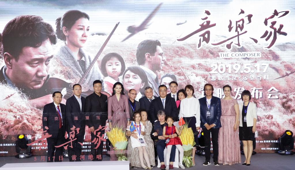 2019年5月13日,中国与哈萨克斯坦合拍故事片《音乐家》在北京举行首映发布会暨首映典礼。影片讲述中国音乐家冼星海于二战期间辗转来到阿拉木图,在残酷环境下得到哈萨克斯坦音乐家救助的故事。图为电影主创人员及嘉宾在首映发布会上合影。新华社记者沈伯韩摄