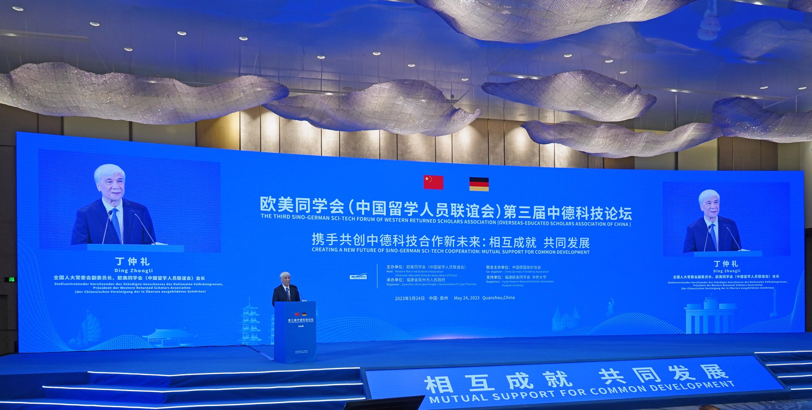5月24日,第三届中德科技论坛在历史文化名城、海上丝绸之路的起点——福建泉州开幕。全国人大常委会副委员长、欧美同学会会长、中科院院士丁仲礼出席开幕式并致辞,国务院侨务办公室主任陈旭发表视频致辞,德国联邦议院前副议长、德中议会小组主席、前联邦内政部长汉斯-彼得·弗里德里希视频致辞,中国德国友好协会会长、中国驻德国前大使史明德,德国驻广州总领事鲁彦出席并致辞。