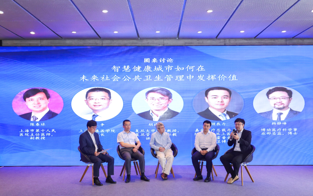 在圆桌论坛环节,上海仁济医院副院长王争、复旦大学管理学院弘毅讲席教授胡建强、嘉会医疗总裁办高级经理顾辰力、博动医疗科学事业部总监韩静峰围绕智慧城市如何在未来社会公共卫生管理中发挥价值进行了深入探讨,对运用物联网、云计算、区块链、智能穿戴、大数据、人工智能等新一代信息技术,通过数字化、智能化手段精准防范卫生健康领域重大风险提出了积极建议。上海市第十人民医院主任医师、副教授陈春球主持圆桌论坛。