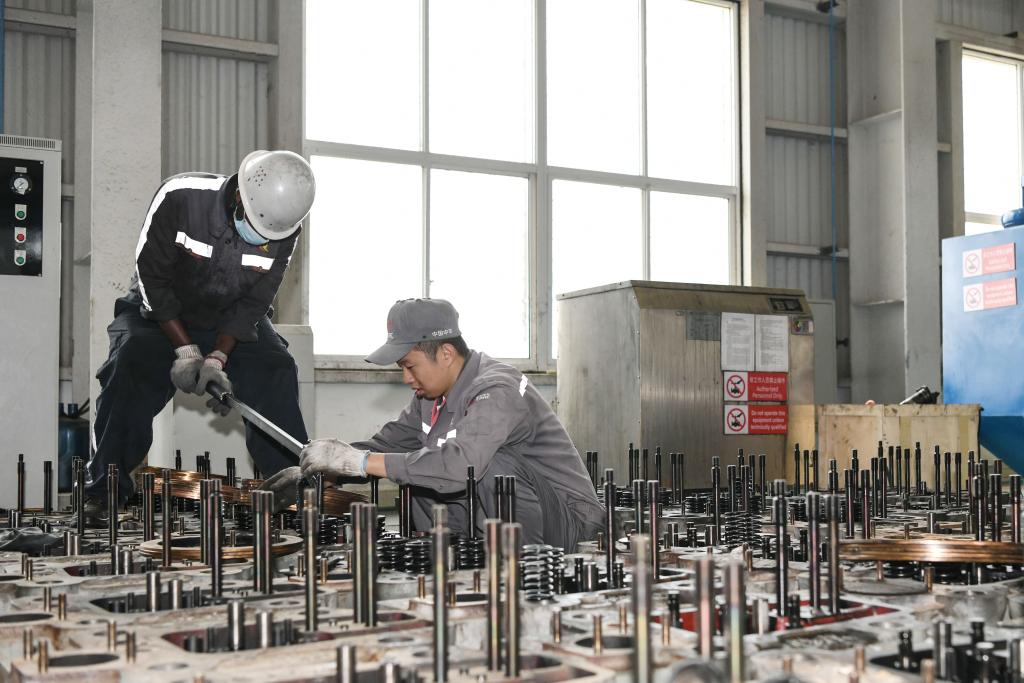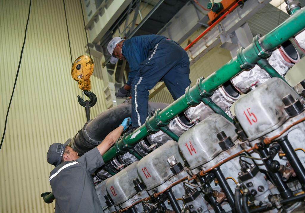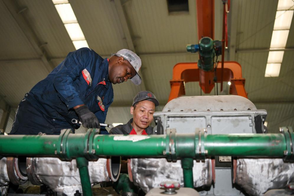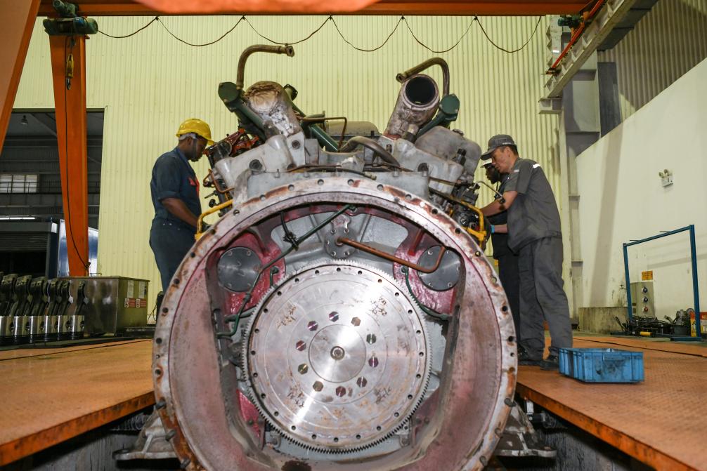 7月4日,在肯尼亚内罗毕的蒙内铁路机车维保车间,中国中车驻肯员工和肯方员工检修机车柴油机。 新华社记者 韩旭 摄