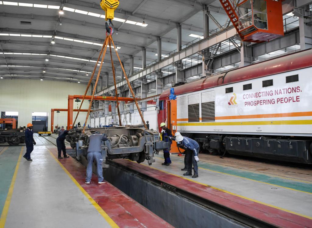7月4日,在肯尼亚内罗毕的蒙内铁路机车维保车间,中国中车驻肯员工和肯方员工调转机车底盘方向。 新华社记者 韩旭 摄