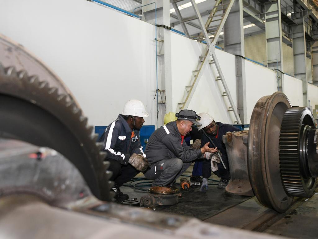 7月4日,在肯尼亚内罗毕的蒙内铁路机车维保车间,中国中车驻肯员工和肯方员工检修机车车轮。 新华社记者 韩旭 摄