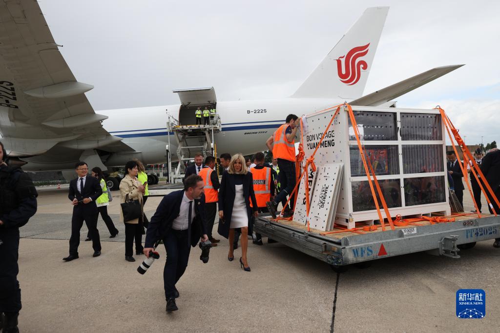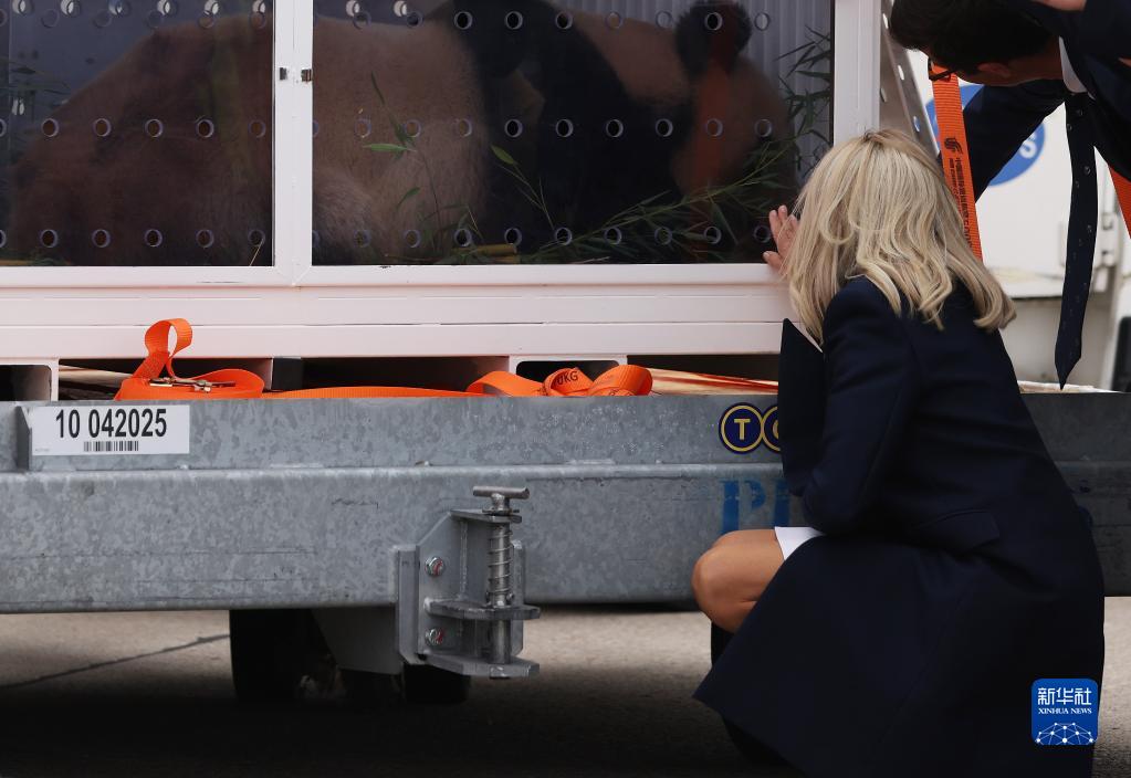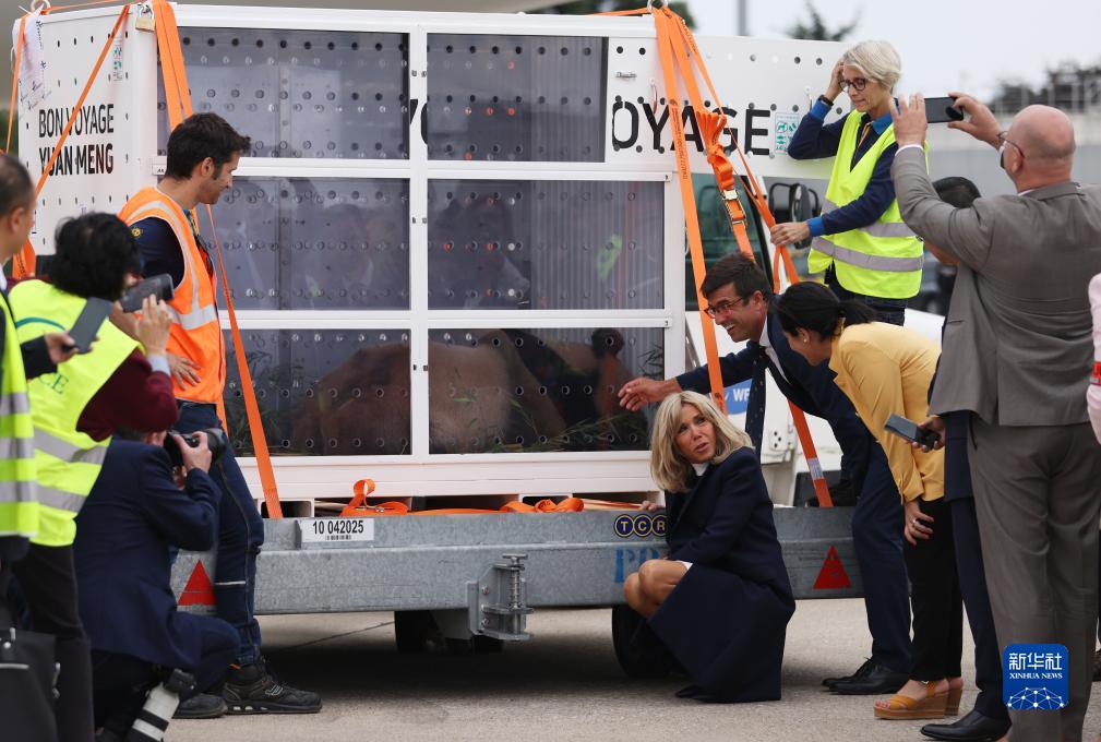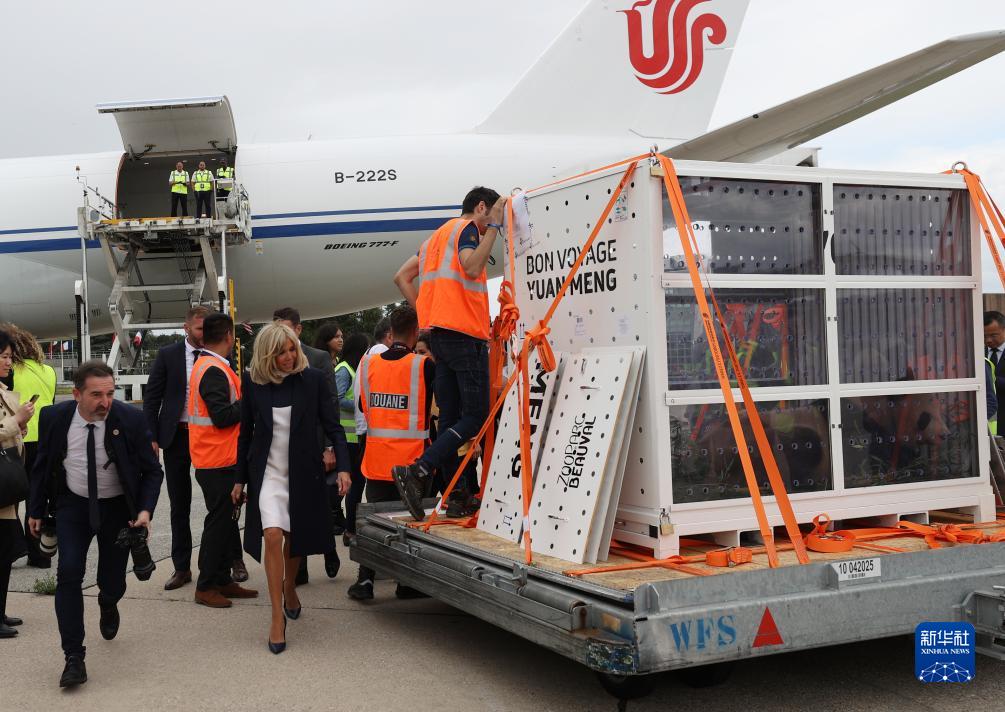 7月25日,在法国巴黎戴高乐机场,法国总统夫人布丽吉特·马克龙(中右)为大熊猫“圆梦”送行。新华社记者高静摄