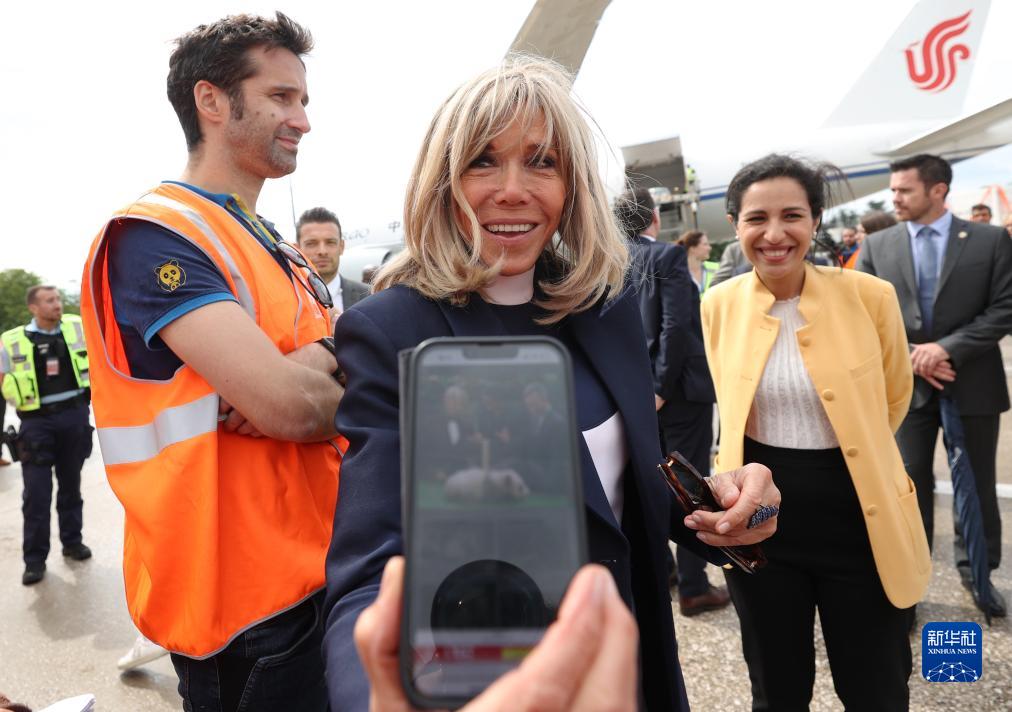 7月25日,在法国巴黎戴高乐机场,法国总统夫人布丽吉特·马克龙用手机展示她与大熊猫“圆梦”的合影。新华社记者高静摄