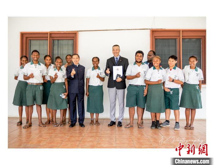 7月5日,中国驻瓦努阿图大使李名刚(左六)和代春超(右六)与瓦努阿图维拉中心学校的学生合影留念。受访者供图
