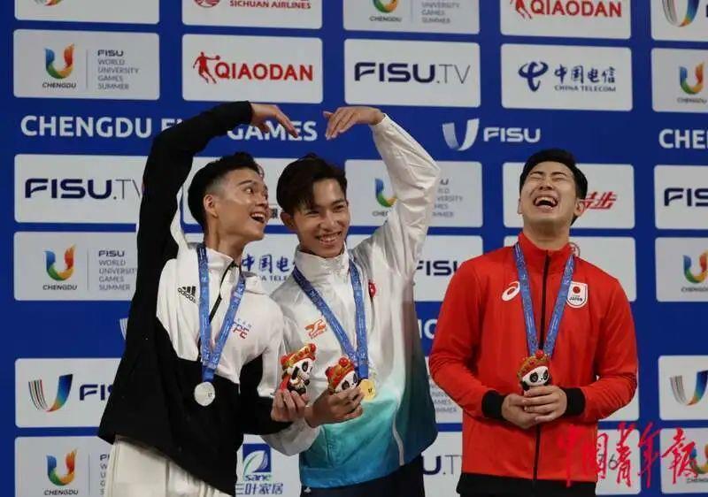7月29日,成都大运会武术比赛男子太极剑项目颁奖仪式上,中国香港选手许得恩(中)与中国台北选手孙家闳(左)“比心”。在成都大运会首个比赛日,他们分别获得这个项目的金牌和银牌,日本选手EBINA Tohma(右)获得铜牌。 (图片来源:中国青年报)