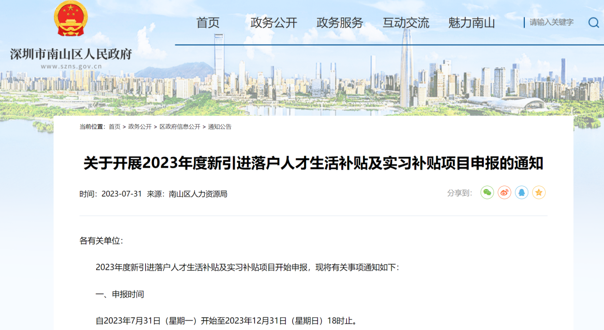 深圳南山区人力资源局近日发布关于开展2023年度新引进落户人才生活补贴及实习补贴项目申报的通知。