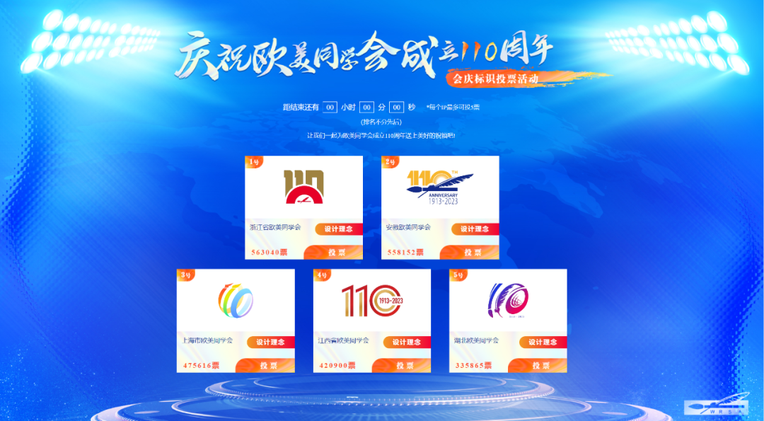 欧美同学会各级各类组织高度重视、精心安排,14个省市欧美同学会推荐了共计25件会庆标识(logo)作品。按照评选规则,从25件作品中评选出5件优秀作品进入网络评选,最终浙江省欧美同学会推荐的作品胜出。