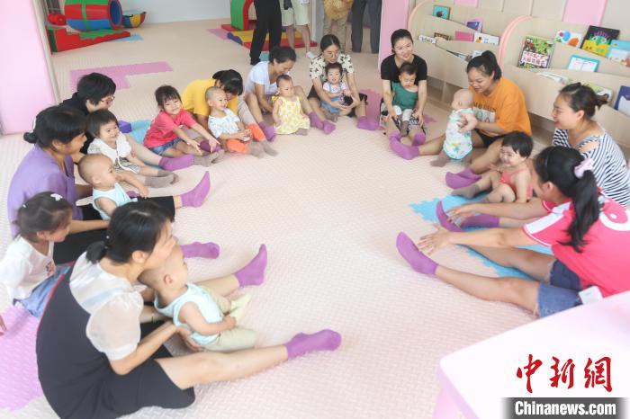 资料图:江西寻乌县一家婴幼儿照护服务指导中心内,工作人员指导家长和幼儿互动做游戏。刘力鑫摄