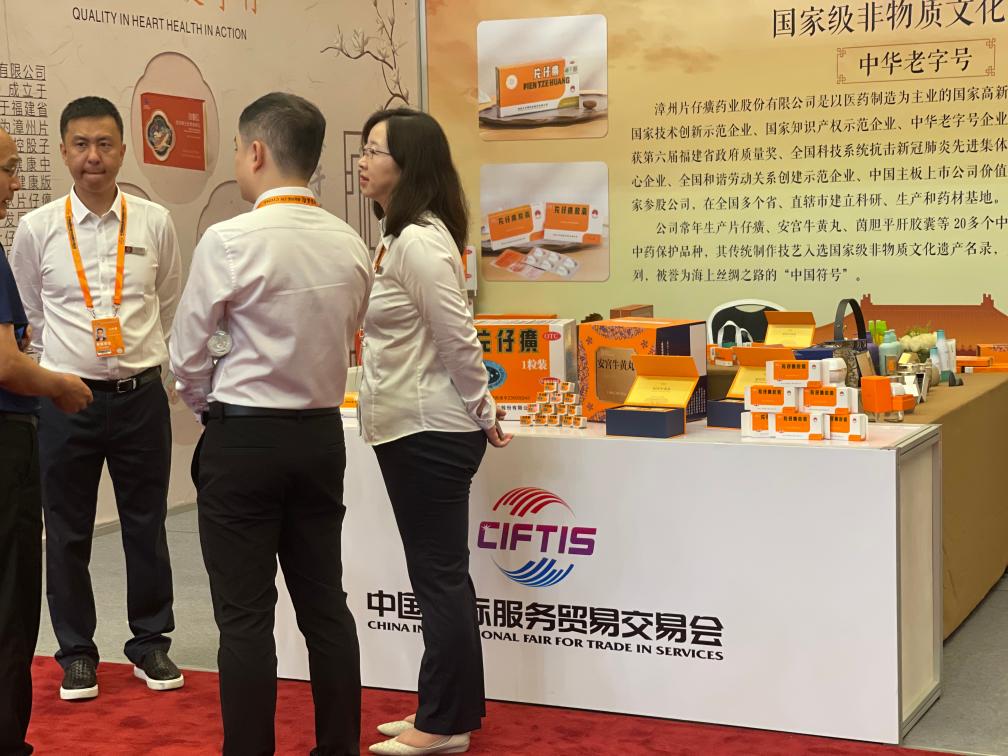 2023年服贸会期间中医药展区,工作人员在交流洽谈。新华社记者李恒摄