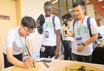 第二十二届“汉语桥”世界大学生中文比赛参赛选手体验中国书法。