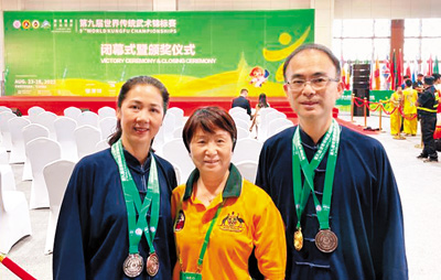 第九届世界传统武术锦标赛上,董蓓(中)率领的澳大利亚武术队获得了一金、两银、八铜的优异成绩。受访者供图