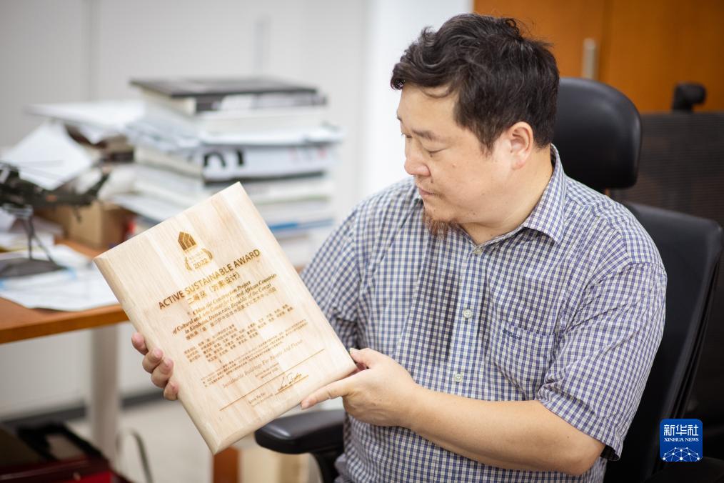 9月12日,在武汉中南建筑设计院总部,唐文胜展示中部非洲文化艺术中心设计方案获奖奖牌。新华社记者 伍志尊 摄