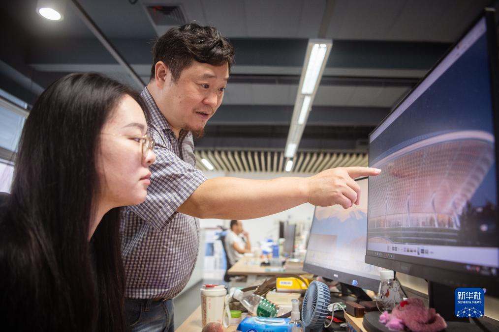 9月12日,在武汉中南建筑设计院总部,唐文胜(右)与同事交流中部非洲文化艺术中心设计方案。新华社记者 伍志尊 摄