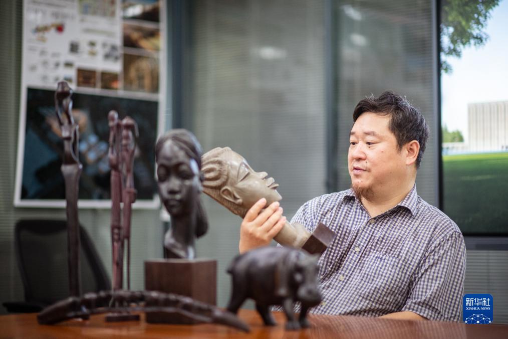 9月12日,在武汉中南建筑设计院总部,唐文胜介绍他收藏的非洲木雕作品。新华社记者 伍志尊 摄